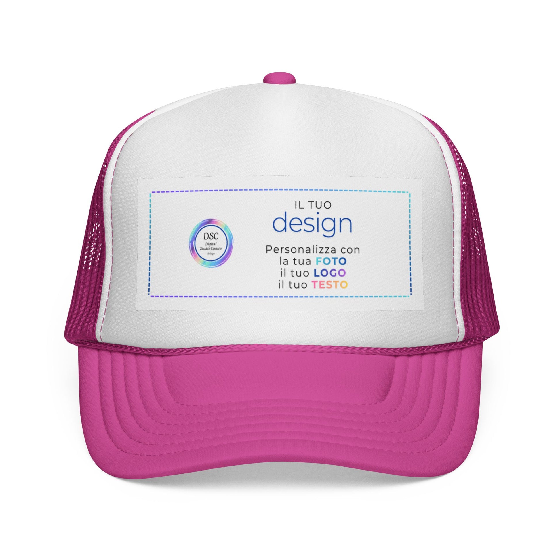 Scegli il nostro Cappello Trucker marchiato Digital Studio Cunico, realizzato con materiali super resistenti per l'utilizzo quotidiano e non solo (100% poliestere anteriore e 100% tessuto in rete di nylon posteriore), il nostro cappello versatile, moderno e leggero, disponibile in più colorazioni differenti, con chiusura a scatto in plastica regolabile per essere comodo e alla moda. Un must da avere assolutamente!